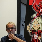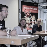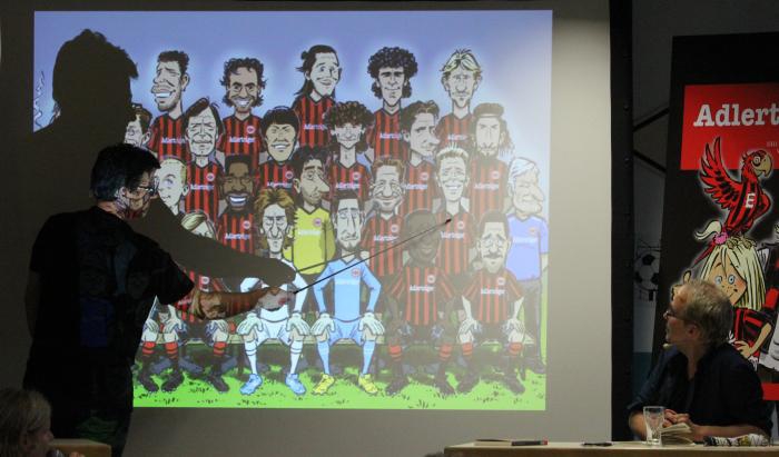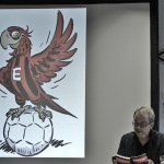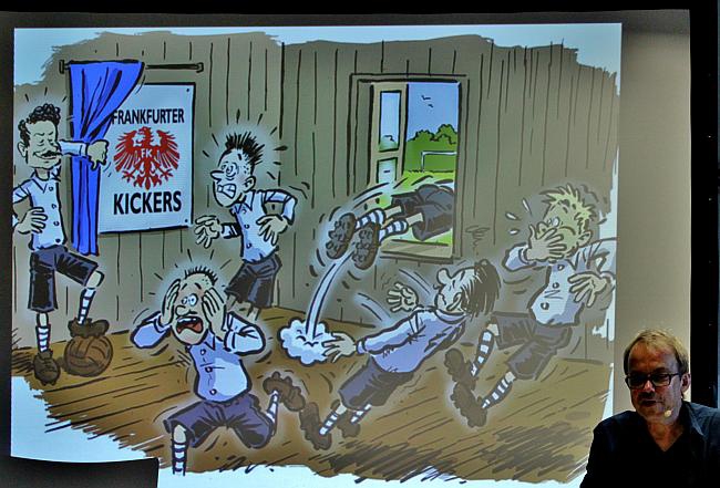 Natürlich war es proppevoll im Eintracht-Museum, als Museumsleiter Matze Thoma die Gäste begrüßte, welche beide nicht zum ersten und ganz sicher nicht zum letzten Mal ihre Zelte im Museum aufgeschlagen hatten. Ich hatte die Ehre, einige einleitende Worte zu finden, bevor es an die multimediale Präsentation der „Adlerträger“ ging. Von der ersten Idee bis zur finalen Vorstellung waren zweieinhalb Jahre ins Land gezogen, in denen Henni und Michael die Geschichte und Bilder entwickelten. Natürlich musste das Eintracht Museum immer mal wieder ein inhaltliches Veto einlegen. „Das stimmt aber nicht ganz“ – mit diesen Worten konnte Matze kleine inhaltliche Korrekturen während der Arbeiten vornehmen, immerhin sollte das Buch neben den fabelhaften Bildern und schönen Wortideen auch inhaltlich den heutigen Kenntnisstand über die Eintracht korrekt abbilden.