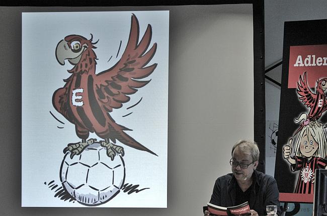 Adlerträger – so heißt das neue Buch über die Geschichte der Eintracht. Es erzählt von Höhepunkten aus 116 Jahren anhand der Erlebnisse der achtjährigen Lilli Pfaff, die gemeinsam mit Opa Bonifaz und Papagei „Adler“ die Eintracht begleitet. Die Texte von Henni Nachtsheim wurden kongenial von Michael Apitz illustriert, vorgestellt wurde das Buch im Eintracht-Museum, das sogar eine Rolle im Buch spielt.