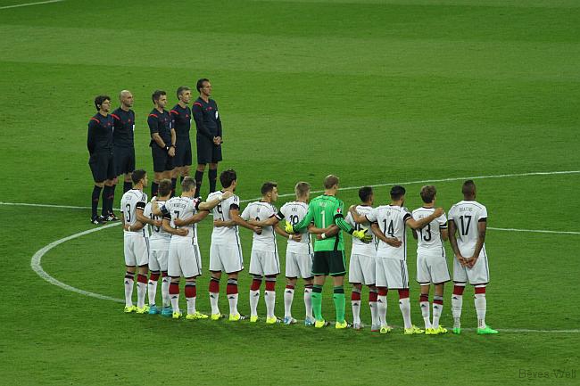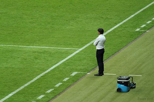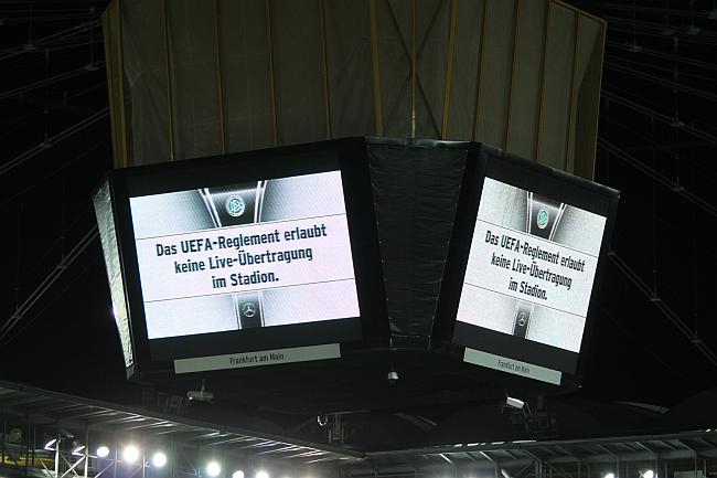 Wir standen in der Ostkurve und guckten uns das Ganze an. Flotter Fußball phasenweise, frühe Führung durch Müller und Götze, Can, der alte Frankfurter, erstmals dabei. Nach dem Anschlusstreffer war Polen dran, einmal Neuer, einmal Götze auf der Linie, Halbzeit. Unten im Museum kurzes Treffen, auf dem TV die Einblendung: Das UEFA-Reglement erlaubt keine Live-Übertragung im Stadion. So ist das hier: Erlauben und Verbieten, vermarkten und verblöden.