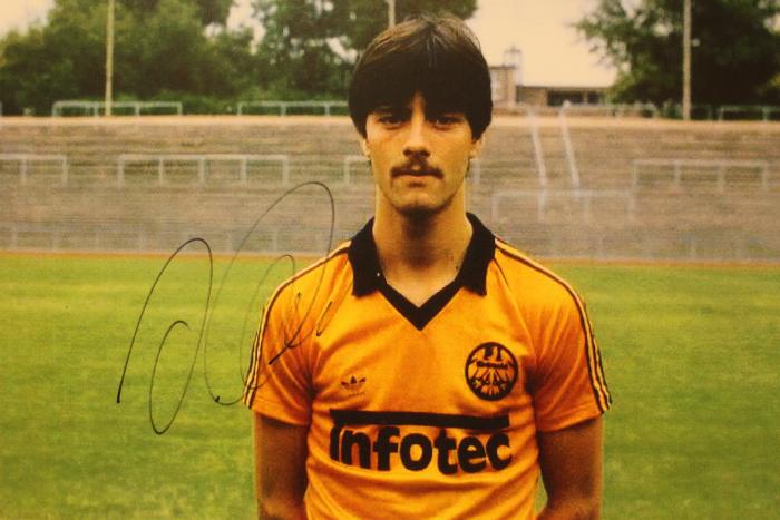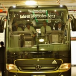 Lustig dann der Abflug der MANNSCHAFT. Hinter dem Museum ist die Einfahrt für den Mannschaftsbus. Wenn die Eintracht spielt, können wir zwar einen Blick wagen, aber in der Regel wacht Security, dass Nichts und Niemand der sache zu nahe kommt. Nun konnte Pia unbehelligt zwischen den Kicker hindurchspazieren und unser auf Pappe gezogenenes Jogi Löw-Bild aus der Saison 81/82 vom Bundestrainer himself signieren lassen, was der Co-Trainer Thomas Schneider so lustig fand, dass er das Bild abfotografierte. Das war dann mal erfrischend unkompliziert. Anbei ein paar Bilder eines dann doch interessanten Tages – es gab ja viel zu sehen, auch wenn nicht alles gefällt.