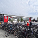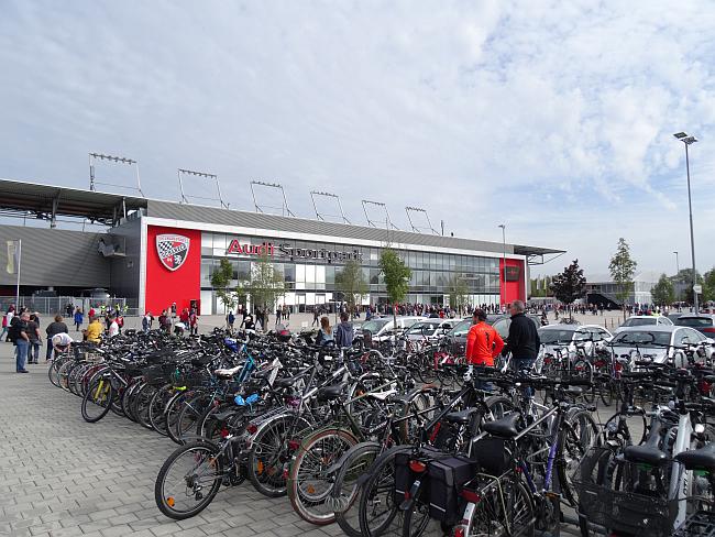 Wenige Schritte hinter dem Einlass ging’s in den Block. Dieser war voll, und du musst dich von unten nach oben schlängeln, war aber kein Problem, wir stellten uns ganz nach oben, hatten eine gute Sicht, die Mannschaften liefen ein und Anpfiff. Das Stadion wirkt schlicht aber funktional, Auf dem Dach glänzten breite Flutlichtreihen in den sonnigen Tag, die Eintracht in schwarzweiß, Ingolstadt in schwarz-rot. Einige Fahnen wedelten vor uns, die Wedelei aber hielt sich dankenswerter Weise in Grenzen, will sagen, wir hatten das Elend gut im Blick. Und in der Tat kickten da unten Not gegen Elend, es war offensichtlich, weshalb Ingolstadt hier noch keinen Treffer erzielt hatte und ebenso offensichtlich bahnte es sich an, dass wenn einer gewillt war, daran etwas zu ändern, dies nur die Eintracht sein konnte. Neben individuellen Fehlern, einfache Ballverluste, Stockfehlern, war augenscheinlich, dass es in der Anlage keine Idee gab, wie die SGE hier gewillt war, Tore zu erzielen. In der Mitte stapelten sich Hasebe, Reinartz, Stendera, Meier, und Castaignos, auf links war Inui in Spanien und so verann die Zeit bis zur Pause. Hasebe war ein Schatten seiner selbst und dennoch durfte er in Halbzeit zwei weiter ran. Sprach der Mainzer Trainer gestern noch von einem Matchplan, von einer Idee, wie Darmstadt zu knacken sei, so offenbarte sich hier in Hälfte zwei ein taktischer Offenbarungseid. Ingolstadt wurde eingeladen zu spielen, dies taten sie wenig berauschend aber druckvoller als die Gäste – und das will etwas heißen.