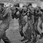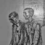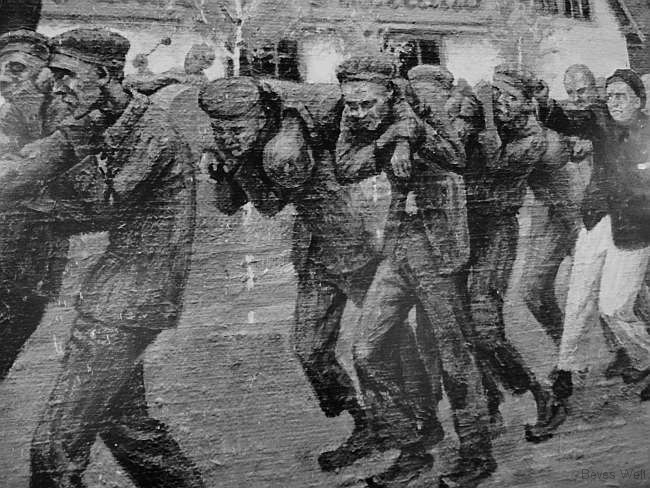 Jetzt bin ich Teil einer jener Gruppen, die ich zuvor von Raum zu Raum huschen sah. Immer stand jemand etwas abseits, immer hat noch jemand auf den Moment eines günstigen Fotos gewartet. Wir durchschreiten erneut das Einlasstor, unsere Führerin, wenn ich das so sagen darf, spricht ausgezeichnet deutsch, es ist kein Problem, ihr zu folgen. Zwei Mädchen aus einer anderen Gruppe, etwas überschminkt aber dennoch hübsch machen ein Selfie, im Hintergrund der Schriftzug mit dem umgedrehten B. Ich höre die imaginäre Musik des Häftlingsorchesters für die von der Zwangsarbeit Heimkehrenden. Eine Zeichnung zeigt einen heimkehrenden Zug der Zwangsarbeiter. Die Ausgemergelten schleppen die noch Kaputteren ins Lager, ein nicht vollzähliges Antreten beim Zählappell hätte für alle fürchterliche Folgen – wenn man fürchterlich noch steigern kann. Zwei SS Männer stehen mit bleckenden Zähnen daneben. Die Heimkehrenden tragen auf ihren Schultern einen Häftling mit einer Dornenkrone, es ist Karfreitag – und noch in der niedrigsten Erniedrigung werden die Häftlinge verhöhnt.