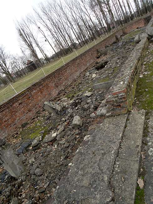 Wir beeilen uns. Eindrücke mengen sich mit der Kälte, meine Finger mühen sich, zu fotografieren. Weiter hinten die Gedenkstätten. Menschen stehen davor, wir gehen weiter. Immer weiter. Wir sehen die Reste eines gesprengten Krematoriums, der zerfallene Auskleideraum, die Gaskammer, grasüberwachsene Ruinen. Jetzt wirkt das weiße Modell aus dem Stammlager nach. Die Ankommenden wurden ihrer Habseligkeiten beraubt, durch eine Treppe in die Katakomben des Grauens geschickt, entkleidet, vergast, geschoren und verbrannt. Vor wenigen Minuten hatten sie sich von ihrer Familie getrennt, vielleicht auf ein Wiedersehen gehofft. Hier, wo ich jetzt stehe.