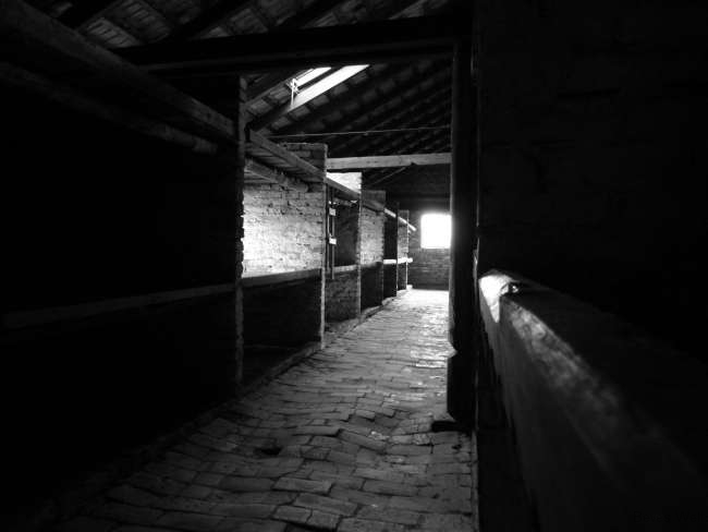 Wir ziehen weiter, vorbei an den Frauenbaracken, die steinernen, die erhaltenen. Nebenan die gemauerten Schornsteine sind Überreste der hölzernen Baracken, die von den Nazis angezündet wurden, um Spuren zu verwischen. Das Holz brannte, die Schornsteine blieben stehen – als stumme Zeugen der Vernichtung. warm aber hatten es die Gefangenen im Winter nie. Dafür um so drückender im Sommer. Wir treten in eine steinerne Baracke ein. Dunkel und kalt.