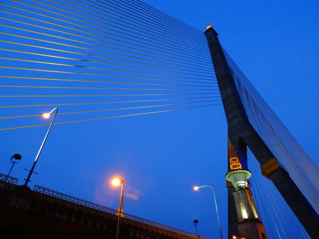 Über Ranong geht es mit dem Nachtbus zurück nach Bangkok, zurück an den Chayo Phraya, zurück in das tosende Leben. Einmal ziehe ich Pia im letzten Moment trotz grüner Ampel zurück, ein Bus rast an uns vorbei. Schnell kann es vorbei sein. Wir besuchen Chinatown, kaufen Souvenirs und futtern an den Ständen oder in kleinen Markthallen, sitzen am letzten Abend auf der gegenüberliegenden Flussseite, wo Thais an den Teppen hocken und aus tönernen Töpfen in denen Holzkohle glüht, ihr Abendessen zu sich nehmen. Das machen wir im kommenden Jahr auch. Nebenan wird geskatet, gekickt, geinlinert. Bunt beleuchtet die Brücke Rama VIII – ein letzter Weg, bevor uns das Taxi sicher zum Flughafen bringt. Der Fahrer drückt uns für nächstes Jahr seine Visitenkarte in die Hand und entschuldigt sich für sein schlechtes Englisch. Ich sage: Mai pen rai. Er lacht.