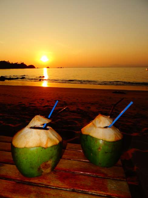 Viele Reisende bleiben nur wenige Tage hier, Nora und Björn bleiben etwas länger. Wir verstehen uns, jeder macht sein Ding und Abends essen wir gemeinsam. Manchmal bestellen wir am Vorabend, das Massaman Curry braucht einen ganzen Tag im Kochtopf, bis es fertig ist – und es lohnt sich, wie sich alles hier lohnt. Björn lernt derweil den Sarong schätzen, das Problem der wunden Oberschenkel bei reibenden Badehosen kenne nicht nur ich, der Sarong aber umschmeichelt die Beine, reibt nicht und ist ein weiteres kleines Glück. Bei Nok nebenan lassen wir uns mit Blick auf das Meer massieren und schweben wie mit einem Gummikörper durch den Tag, der mit dem Sonnenaufgang um 6:32 Uhr beginnt. Eines Tages fahren Pia und ich auf die andere Seite der Insel auf das Longtailpier, überstehen die auf uns zu rennende Hundemeute, die sich dann doch friedlich um uns schart und erleben den frühen Morgen mit der aufgehenden Sonne.