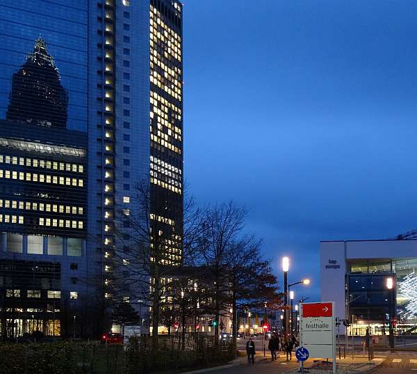 Frankfurt, rund um die Messe, einstiger Güterplatz. Heute führt die Europaallee Richtung Kuhwald, die Lichter der Hochhäuser leuchten in den blauen Abendhimmel, ein großes Einkaufszentrum zieht Menschen an, das Skyline Plaza. Ein paar Meter nebenan ragt der Messeturm in die Höhe, ich weiß noch, wie ich Anfang der Neunziger, als der Turm gebaut wurde kurz nach Silvester mit Freunden die Baustelle geentert habe. Der Turm war nahezu fertig, es fehlte die gläserne Pyramide. Der Ableger eines wahnwitzig hohen Krans führte auf das Dach des Turms, wir aber nahmen die Stufen und erklommen die Treppen Stockwerk für Stockwerk. Ab und an entdeckten wir die Reste einer Silvesterfeier, leere Flaschen, Kippen. Wir konnten bis nach ganz oben klettern, zwei Holzbohlen führten zum Kran, an der Seite ein zerbrechliches Geländer, es war der tägliche Weg des Kranführers zu seinem Arbeitsplatz, wir blickten im Wind rund um Frankfurt, und durch die schmale Stelle zwischen den Bohlen über 200 Meter tief auf die Straße, den brausenden Verkehr, ein gleichermaßen erhabenes wie mulmiges Gefühl.