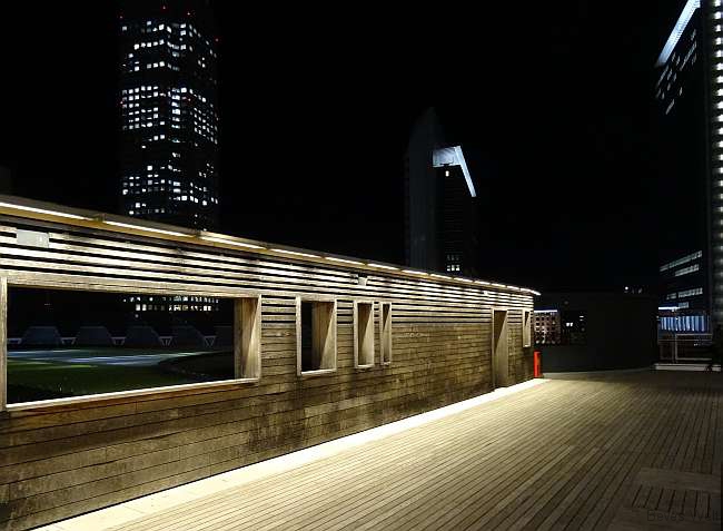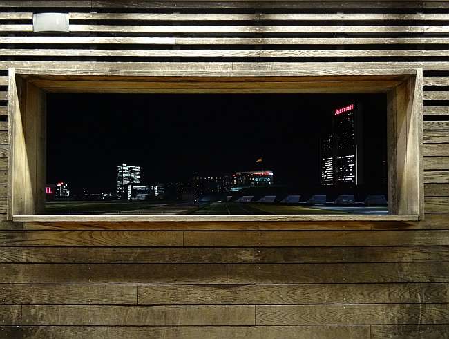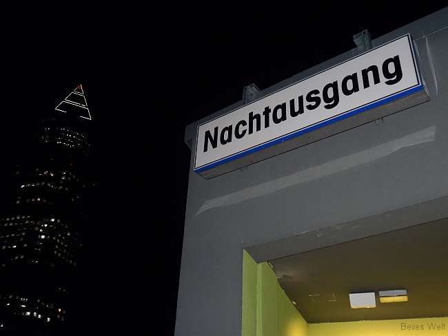 Ein Fahrstuhl führt nach oben, auf dem Dach des Gebäudes befindet sich ein Garten und eine Aussichtsplattform, Frankfurt in der Dunkelheit, auf der Festhalle weht die Deutschlandfahne, es ist der beste Platz im ganzen Gebäude, irgendwo dahinten fließt der Main. Ich rauche, der Blick schweift in die Ferne, trifft den Messeturm. Ich sehe mich dort oben, damals 1991 im Januar.