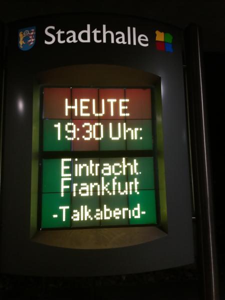 Alleine die Hinfahrt war spaßig, zwar ging es im Eintracht-Jeep gleich nach dem Stadion in den A5-Stau, aber mit Matze und Stepi im Auto wird es ja nie langweilig. Und wir landeten pünktlich vor der Stadthalle in Stadtallendorf, rund 120 Kilometer liegen zwischen hier und Frankfurt, eine Strecke, die der hiesige EFC bei jedem Heimspiel zu meistern hat. Und der EFC Adlerhorst Stadtallendorf fungierte auch als Gastgeber, während das Eintracht Museum und die Fufa als Veranstalter auftraten.