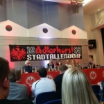 Rolf Heller, langjähriger Abteilungsleiter Fußball und Präsident der Eintracht zwischen 1996 und 2000 ist Ehrenmitglied des EFC Stadtallendorf. Schon beim 10-jährigen Jubiläum des EFCs war er hier zu Gast. Diesmal saß er neben Stepi – den er 1996, als die Eintracht quasi auf einem Abstiegsplatz der zweiten Liga stand, entlassen musste. „Ich ging in die Kabine und sagte: Stepi, das war’s“. Stepi nahm es heute mit Humor und am Ende der Veranstaltung saßen sie beide Arm in Arm nebeneinander. Natürlich hatten beide viel zu erzählen, so von der Amtseinführung Hellers, als bei der Eintracht keiner Präsident werden wollte. Ohms Zeit war nach dem Abstieg vorbei, der Kurzzeitpräsident Otto war mit Schatzmeister Thate schon nach wenigen Tagen Geschichte und Peter Rhein, der als Nachfolger gekürt werden sollte, fiel aufgrund einer obskuren Begebenheit (über die ich hier den Mantel des Schweigens lege) kurzfristig aus dem Rennen. Letztlich fiel die Wahl auf Rolf Heller, der gemeinsam mit Gaetano Patella und Horst Ehrmantraut den Karren aus dem Dreck zog. Allerdings war zum Zeitpunkt des legendären 5:1 gegen den 1.FC Kaiserslautern Ehrmantraut schon wieder des Amtes enthoben. Als der Versuch mit Reinhold Fanz gänzlich daneben ging, verpflichtete Heller Jörg Berger am Verwaltungsrat vorbei, ein Schachzug, der aufging.
