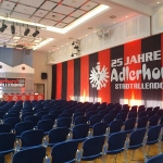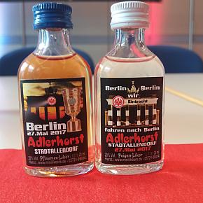 Der kleine Saal war schon mit dem großen EFC-Banner geschmückt, den die Stadtallendörfer anlässlich ihre 25jährigen Bestehens anfertigten und wie immer hier, war die Orga tiptop. Sogar kleine Schnapsfläschchen mit einem Aufkleber ob des anstehenden Pokalfinales wurden präsentiert. Und natürlich wurde es ein bunter Abend, sogar der Bürgermeister war vor Ort.