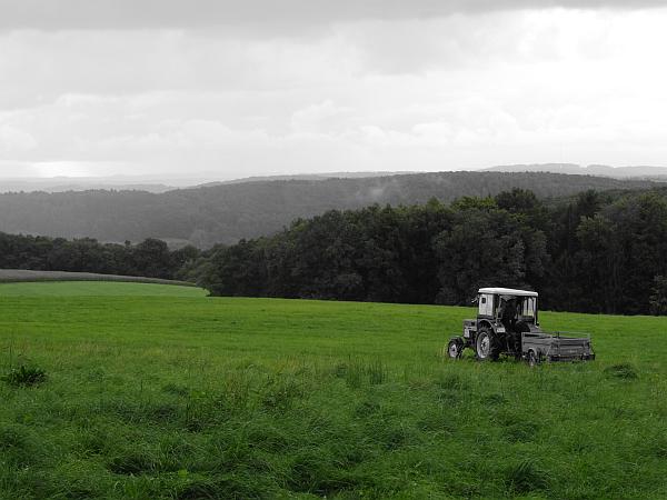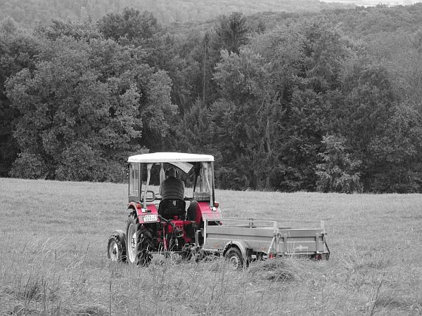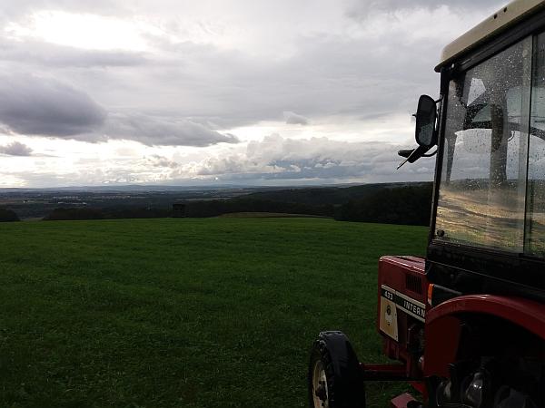 Der Trecker hatte vor Jahren ein Verdeck spendiert bekommen, seinerzeit eine kostspielige, aber nützliche Ergänzung. Du hast bei Regen ein Dach über den Kopf und eine große Fensterfront, die im Zweifel Nässe und Wind abhält, der Scheibenwischer ist allerdings eher einem Goggo entnommen, aber wir werden ihn nicht brauchen. Vor uns entfalten sich die Hügel und Täler des Taunus in sattem Spätsommergrün, nach jeder Biegung ein neues Panorama. Fahren wir auf der Landstraße durch Wälder riecht es nach Feuchtigkeit und Wald, nur wenn das Verdeck geschlossen ist, mengt sich der Diesel mit der Natur. Bremsen kannst du mit dem Trecker kaum und wenn, dann über das mächtige Getriebe, die Gänge aber wollen beherrscht werden; wenn du nach unten rollst und bei hoher Drehzahl runterschalten willst – vergiss es. Zweieinhalb Tonnen schieben mächtig – und so ist die Beherrschung des Gefährts selbst bei 20 Kilometern die Stunde stets eine kleine Aufgabe, vor allem wenn du einen PKW gewohnt bist. Wir fahren abwechselnd, Chris beherrscht das Gefährt recht gut, immerhin gehört er ihm, und auch ich fahre nicht das erste Mal solch einen Kameraden. Zuletzt bin ich vor ein paar Jahren mit Arndts Ferguson rund um die Kapersburg geknattert. Die Gedanken schweifen ab, ich denke an die Kindheit, als in dem Ort, in dem meine Mutter groß geworden ist, Mömlingen, unser Nachbar einen knallroten Güldner besaß, in dem wir oft auf die Felder gefahren sind, im Hänger Weizen oder Äpfel, die zum Keltern gebracht wurden. Der Nachbar lebt schon lange nicht mehr und wer weiß, ob der alte Güldner noch irgendwo steht.