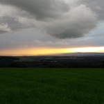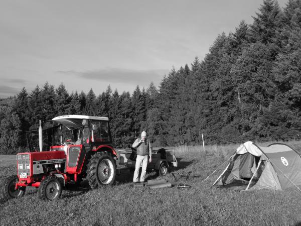 Hinter Münster geht es nach Aumenau und auf den frühen Abend zu, die Eintracht steckt in der Nachspielzeit und führt immer noch 1:0, wir tuckern Richtung Elkerhausen, verfranzen uns kurz auf der Suche nach einer Übernachtungsmöglichkeit, was aber den 34 PS und dem zweiten Gang nur ein Grinsen wert ist und fräsen uns einen Feldweg auf der anderen Seite nach oben. Hinter uns der Wald, vor uns eine abgemähte nach unten fallende Wiese und dazu einen Blick über das Lahntal Richtung Limburg. Hier bleiben wir. Kahle Flächen am Wiesenrand zeugen von suhlenden Wildschweinen, im feuchten Gras tanzen die Nacktschnecken Polka. Ein kleiner Regenschauer wäscht für uns noch einmal alles sauber, dann bauen wir an einer der wenigen geraden Flächen unser Zelt auf, sammeln ein paar Hände voll lange getrocknetes Astholz, packen ein paar Steine auf die Wiese, legen die Grillschale oben auf und blicken rauchend auf Schemeln sitzend ins Tal. Die ersten Lichter gehen drunten an, die Dämmerung legt sich über uns, hinter dem Wald beginnt der Mond zu leuchten und leiser Nebel steigt von der Lahn auf. Kaum sind die Bratwürste durchgegrillt, erwischt uns ein nächster Schauer. Wir harren der Dinge im geschützten Traktor. Nach wenigen Minuten ist zwar alles nass, jedoch nicht die wichtigen Dinge und so feuern wir mit dem Sammelholz in der Grillschale ein Nachtfeuer an. Mit einem Glas Äbbelwoi in der einen, einer Cigarette in der anderen Hand blicken wir Richtung Westen und trocknen die Schuhe am Feuerchen. Unsere Musik ist das Rauschen der Wipfel und der Ruf der Waldvögel. Nebenan wacht treu Rudi, der Trecker, wie ein alter Schäferhund über uns. Die Eintracht aber hat tatsächlich in Gladbach gewonnen.