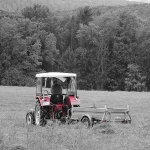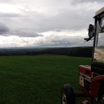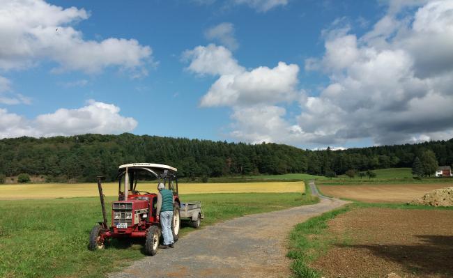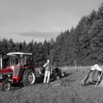 Die nächsten Kilometer werden die letzten sein, langsam macht sich auch das Gerüttel und Geschüttel des Treckers bemerkbar, leichte Dröhnung im Schädel begleitet uns auf den letzten Metern durchs Lorsbacher Tal Richtung Hofheim. Und kaum sind wir in Hofheim eingerollt, schreiben Matze und Nicoletta, dass sie uns soeben vom Wald aus gesehen hätten – auch so hat sich ein kleiner Kreis geschlossen. Als wir am Hoftor ankommen, blicken Kinder uns und vor allem den Trecker freundlich an. Die begleitenden Erwachsenen haben auch eine Geschichte zu erzählen, so ein Traktor weckt Erinnerungen und wird fast immer willkommen geheißen. Wer Traktor fährt, kann kein böser Mensch sein, so scheint es; der Trecker erinnert, vor allem wenn er älter ist, an eine untergegangene Welt, in der Vater, Onkel, Großvater selbst noch selbstverständlich über die Felder pflügten, das Heu staubte und die Äpfel noch auf den Bäumen hingen und nicht in Plastik verpackt im Supermarkt. Eine untergegangene Welt, die wir alle lieben, da wir sie als natürlicher empfinden und an deren Abschaffung doch alle mitarbeiten. „Digital first, Bedenken second.“