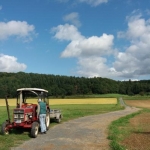 Schon der Start der Tour ist bemerkenswert, ich kenne in Hofheim ja nicht wirklich viele Leute, aber das nahezu alle zufällig bei uns vorbei marschieren, ist erstaunlich. Während Matze und Nicoletta uns bei ihrem Wochenendeinkauf entdecken, fällt Anke aus der Tür um die Ecke. Ein großes Hallo – und schon tuckern wir über die Hauptstraße, Chris, der Trecker, ein kleiner Anhänger und ich. Die ersten Kinder winken uns fröhlich zu.