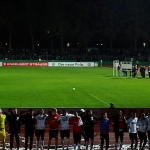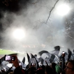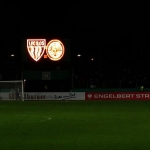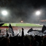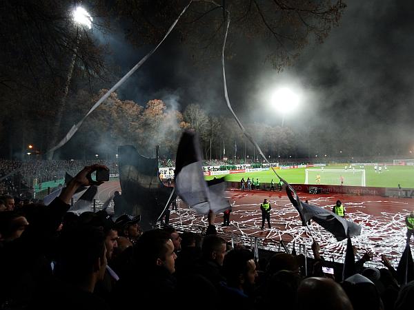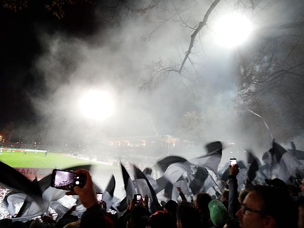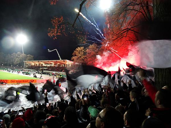 Sodann brechen wir auf Richtung Willy-Sachs-Stadion, es dürfte das einzige Stadion in Deutschland sein, welches nach einem hochrangigem SS-Mitglied benannt ist, dies scheint man hier locker zu sehen, schließlich ließ Willy Sachs einst etliche Taler für die Stadt springen. Zunächst sieht wenig bis nichts nach Fußball aus, doch nach wenigen Minuten erreichen wir die Bundesstraße, die zum Stadion führt, und nun stauen sich auch die Autos. In einiger Entfernung glänzt das Flutlicht – und kaum dachten wir, wir hätten es geschafft, werden die Kurvengäste rund um das Stadiongelände mit Trainings- und Tennisplätzen geleitet, ein Fußmarsch, der länger scheint, als der Weg von der Stadt bis zum Haupteingang, die letzten Meter sind unbeleuchtet. Am Eingang selbst herrscht ein ordentliches Gedränge, noch ist die Masse überschaubar, aber ein einziger Eingang für alle führt kurz vor den Ordnern zu einem Anflug von Massenpanik. Da ist es eine herausragende Idee der Polizei, mit mehreren Leuten gegen den Strom zu drücken, um hindurch zu gelangen, es wird ungemütlich. Aber wir überleben den Einlass und blicken in ein Oldschool-Stadion, in dem der Geist der Fünfziger Jahre atmet. Flutlichtmasten bestrahlen den Rasen, die unüberdachten Kurven fügen sich mit der ebenfalls unüberdachten Gegengerade zu einem harmonischem Oval, einzig die Haupttribüne bietet vor optionalem Regen Schutz. Vor meinem geistigen Auge sehe ich Jahrzehnte vor mir tausende Männer in Mäntel und Hüten mit gespannten Regenschirmen hier stehen, umrandet von Bäumen skandieren sie „Willy Sachs“ welcher huldvoll und trunken in seiner Uniform von der Haupttribüne aus winkt.