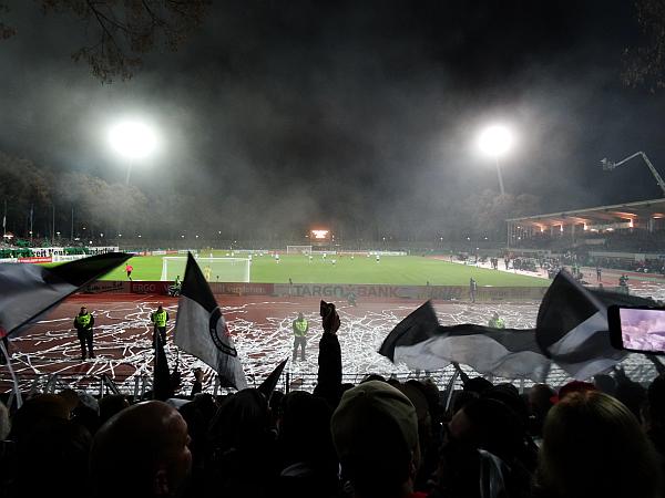 Im Stehplatzbereich wird es langsam sehr voll, immer mehr drängen hinein, die Hütte wird voll, die maximale Kartenkapazität von 15.060 wurde ausgeschöpft, dabei sind zwei Blöcke als Puffer frei gelassen. Der Stadionsprecher weist unermüdlich darauf hin, dass auf einer Stufe zwei Reihen stehen können. Irgendwann hat irgend jemand ein Einsehen, ein gesperrter Block wird geöffnet, die Lage entspannt sich. Der harte Kern der Schweinfurter steht in der Gegengerade.