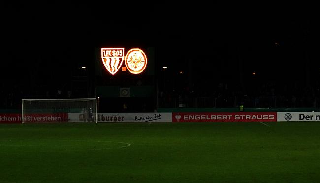 Kaum laufen die Mannschaften ein, schwenkt unsere Kurve hunderte Fähnchen, Bengalos flammen auf, Kassenrollen flattern auf die Laufbahn, Silvesterrakten steigen in den Nachthimmel von Schweinfurt. Pyro in der Nacht hat ja immer den Vorteil, dass man auch in der Dunkelheit ein paar gescheite Fotos hin bekommt. Die brennenden Kassenröllchen werden von der Feuerwehr beherzt gelöscht. Alsdann beginnt sowohl das Spiel als auch auf den Rängen ein buntes Programm mit traditionellem Liedgut. Es ist immer was los beim Fußball, mit bloßen gucken kommst du hier nicht durch. Hände hoch, Hände runter, Wechselgesang hier, Schweinfurt-Schweine, Nürnberg-Schweine, Singen, Klatschen, das geht Schlag auf Schlag. Dafür dauert es dann zuweilen etwas länger bis auffällt, dass die Eintracht ein Tor geschossen hat, Hallér hat’s gemacht, doch in der Folge friemelt sich Schweinfurt ins Spiel und kommt sogar zu Chancen. Die Anzeigetafel blinkt immer wieder vor Aufregung über Ecken oder Zuschauerzahlen, zuweilen fordern zwei animierte Hände zu gepflegtem Applaus auf – wie einst bei den Anfängen der Digitalisierung.