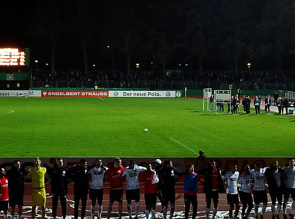 In Halbzeit zwei haben die „Schnüdel„, wie sich die Schweinfurter nennen eine Riesenchance zum Ausgleich, versemmeln aber und alsbald übernimmt die Eintracht das Kommando. Erneut Hallér sowie Wolf und Blum schießen einen ungefährdeten Sieg heraus, derweil auch die „Schnüdelultras“ ein kleines Feuerwerk abbrennen. Gemeinsam wird dann noch der DfB gefeiert, doch die Verbrüderung der Fanlager währt nur kurz, um dem Anspruch der Frankfurter Arroganz gerecht zu werden, heißt es dann wieder: Schweinfurt-Schweine. Ihr dürft zwar kurz mit uns spielen, aber dann wieder ab in den Käfig. Schnüdel ist übrigens das Lederbändchen, welches die alten Fußbälle an Stelle eines Ventils zusammenhielt. „Steht auf, wenn ihr Schnüdel seid“ heißt es dann auch von uns, eine Ironie, die nicht jedem in der Kurve gefällt.