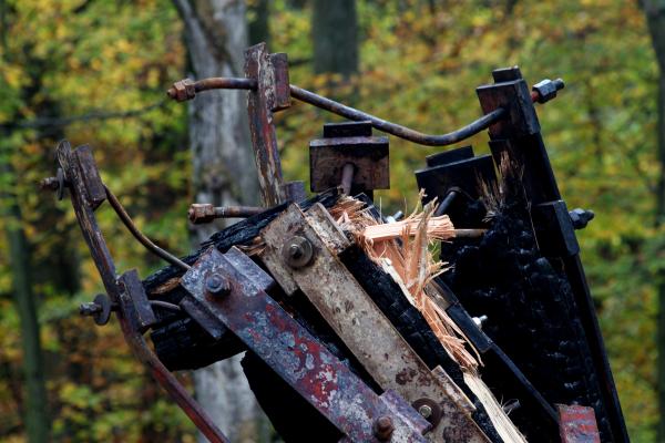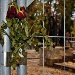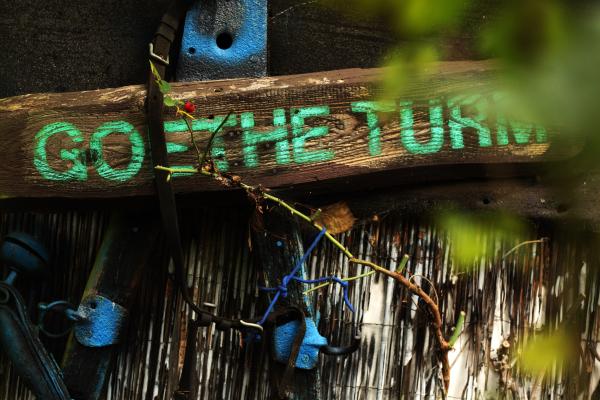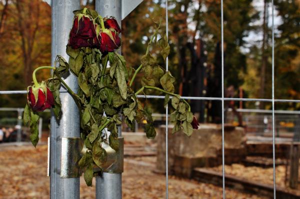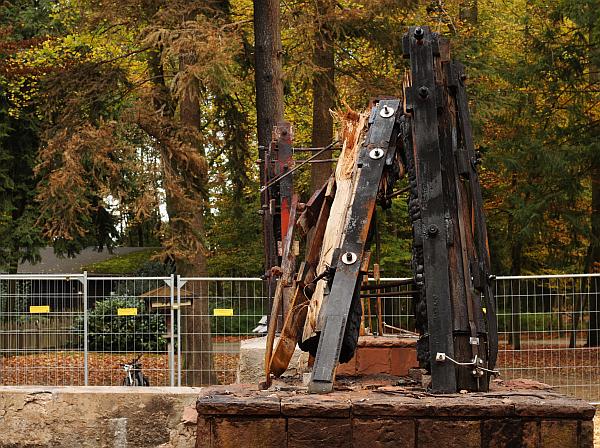 Am Zaun der Brandstelle des Goetheturms hängen Rosen. Ein paar Schritte daneben grinst Martin Schulz von einem Wahlplakat in den Bäumen.
