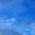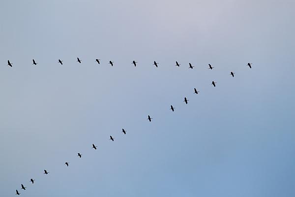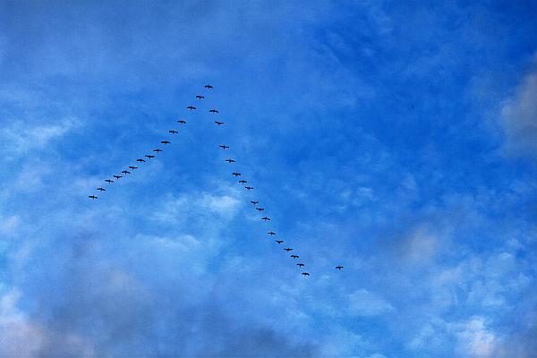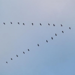 Zurück am Stadtwald in Oberrad künden Töne schon von Weitem vom Zug der Kraniche, Hunderte, vielleicht Tausende, ziehen über uns hinweg, ein faszinierendes Schauspiel. Ein landendes Flugzeug in niedriger Höhe scheucht die Vögel auf, sie verlieren ihre Position, müssen sich neu sortieren, es dauert eine Weile, bis sie sich gefunden haben. Dann ziehen sie weiter, in den Süden. Wir aber bleiben hier, in dieser Stadt mit ihrem Wandel. Mit Investorengruppen und einer Politik, die dies fördert und uns als positives Wachstum verkauft. Abgeschöpft wird der Rahm von Wenigen, der Rest balgt sich um die Brosamen und weiß nicht wohin. Thomas Müntzer kannte dies, wollte es ändern – und bezahlte mit dem Tod.