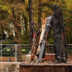 Wir sind nicht die Einzigen, die wehmütig vor den abgesperrten Brandresten stehen. Im Café nebenan ist reger Betrieb. Jemand hat einen kleinen Goetheturm gebastelt und ihn mit Kabelbindern am Zaun festgemacht, ein Plastikhündchen schaut uns von dort an. Wahrscheinlich wird es bald geklaut. So wie einst in meiner Straße in Oberrad ein Haus abgebrannt ist, zwei Menschen kamen ums Leben, Italiener. Zum Gedächtnis legten Freunde und Bekannte Devotionalien vor das Grundstück, darunter ein Trikot der italienischen Nationalmannschaft. Wenige Tage später kündete ein Zettel am Tor von dessen Diebstahl.