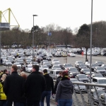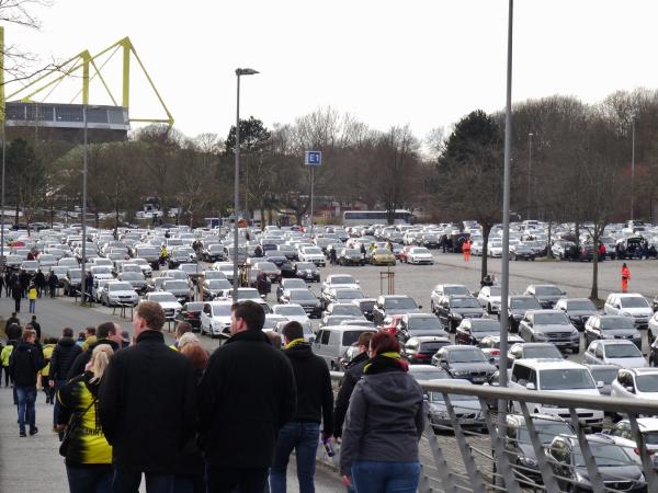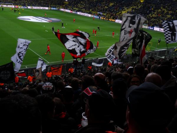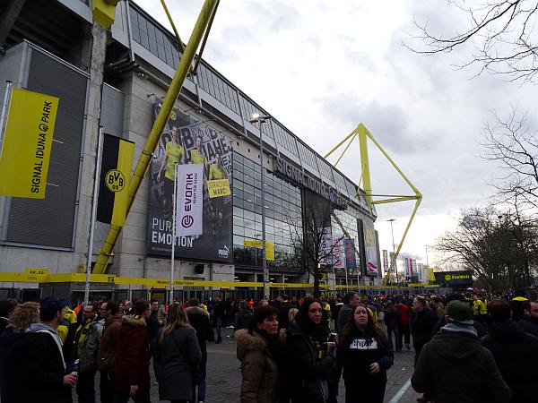 Kurz nach 13:00 Uhr also rollte ein schwarzer Kleinwagen auf die Autobahn, der Frühling winkte dezent zu uns herüber und wir schwatzten über Gott und die Eintrachtwelt und über Batshuayi, der beim BVB zunächst einschlug wie ein Großer, um dann mit Toren sparsamer zu werden. Wir überholten die Busse aus Stadtallendorf und die Nieder Bube, hielten kurz an der Raststätte Siegerland, lauschten dem Detonieren einiger Böller und erreichten Dortmund nach etwas mehr als 2 Stunden und 15 Minuten. Hinter dem Westfalenstadion auf Parkplatz F1 stellten wir die Kiste ab und wanderten Richtung Stadion, vorbei an der TSC Eintracht von 1848.