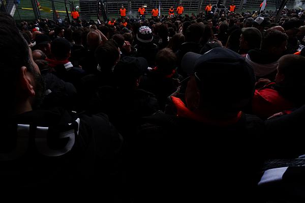 Während sich die allermeisten Eintrachtler brav am Einlass anstellten, war zwei Meter um die Ecke ein weitere Einlass, der weitestgehend ignoriert wurde, praktisch für uns, so waren wir schnell drin und enterten den Stehplatzbereich, der eine Stunde vor Anpfiff schon recht ordentlich gefüllt war. Traditionell fanden wir unseren Platz recht weit oben, am Rande des Treppenbereichs, der gelb markiert war. Ein eifriger Ordner wies emsig darauf hin, dass der markierte Bereich frei bleiben müsse, ein hilfloses Unterfangen, den unerlässlich strömten die Fans in den Block 61, schoben und drückten sich in die Reihen, mal mehr, mal weniger freundlich.
