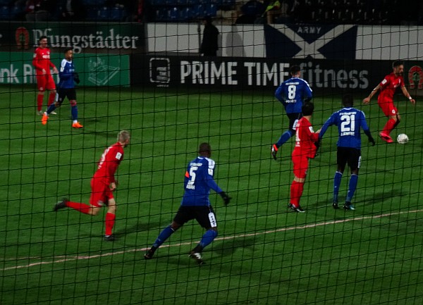 Nach Anpfiff legen die Kickers, ganz in rot, mächtig los, der FSV steht dem Ganzen unsortiert und schlafmützig gegenüber – und so dauert es auch nicht lange, bis der OFC führt. Der Gästeanhang freut sich und wir schauen bedröppelt aus der Wäsche. Aber binnem Kurzem wird es ein ganz anderes Spiel, der FSV erwacht, kombiniert und schon fällt der Ausgleich. Und Bornheim bleibt weiter am Drücker, hat Chancen. Aber es kommt, wie es kommen muss, ein Konter reicht und die Kickers führen mit 2:1.