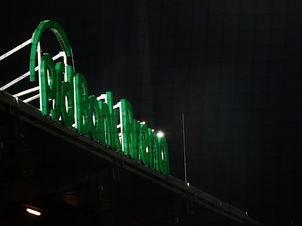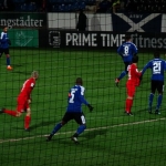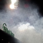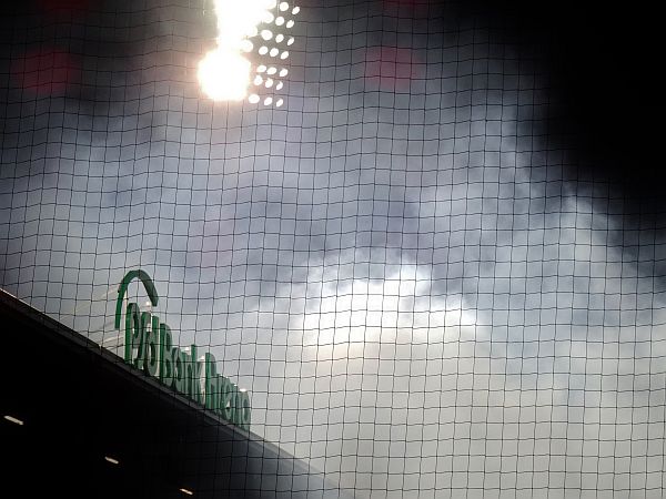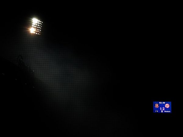 Der Gästeblock ist gut gefüllt und macht naturgemäß weitaus lauter auf sich aufmerksam, als es die Heimkurve könnte. Beim FSV ist es ja stets recht gemütlich, jeder macht irgendwie, was er will, einer pöbelt, einer trinkt Bier, ein paar rufen EFF ESS Vau und der Rest friert. Das Stadion hier hat ja seit ein paar Tagen einen neuen Namen, es heißt jetzt offiziell PSD Bank Arena. Von daher gibt es vor Spielbeginn einige Feierlichkeiten – und hinter der Haupttribüne illuminiert Feuerwerk den kalten Märzhimmel. Wer auf der Haupttribüne sitzt, kann es nicht sehen – und für mich wird es bis zum letzten Atemzug der Bornheimer Hang bleiben. Mit klassischen Flutlichtmasten. Wer hätte je gedacht, dass der Anblick solcher Masten ein nostalgischer ist?