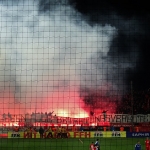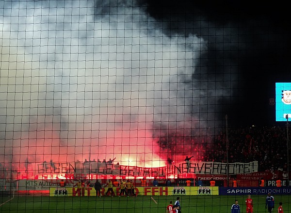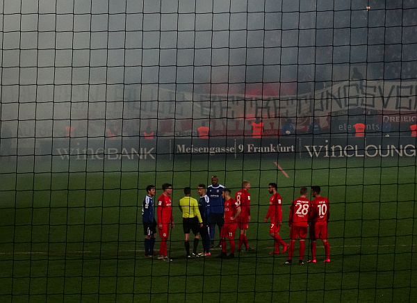 In der zweiten Hälfte entwickelt sich ein ausgeglichenes, zuweilen hitziges Spiel, auf den Rängen sind die Anhänger des OFC zu hören. Ihr seid scheiße, wie die SGE. Dann entrollen sie ein Banner, „Gegen alle Betretungsverbote“. Unmittelbar darauf setzen die Kickers ihr eigenes Feuerwerk in Gang, ein paar Raketen fliegen in die Luft, Rauchschwaden überziehen den Platz. Das Bier aber wird den FSVlern um die Ohren geworfen, die Eckbälle vor der Gästetribüne ausführen dürfen. In der FSV Kurve bleibt es überschaubar ruhig, nur im anderen Eck setzen die Bornheim Ultras ein paar Fackeln in Gang, das war’s. Ein Elfmeter für den OFC bringt den 1:3 Endstand, der FSV müht sich, bringt aber nichts zählbares mehr zu Stande. Kurz vor Ende verlasse ich den Hang – und muss aufpassen, dass meine Beine nicht gleich Eiszapfen beim Laufen durchbrechen.