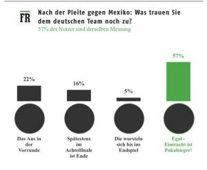 Das letzte Mal als ich so richtig mit der Nationalmannschaft mitfieberte war 1986, was war ich geknickt, als Burruchaga das 3:2 für Argentinien erzielte, zumal kurz zuvor Rummenigge und Völler aus einem 0:2 noch ein 2:2 gemacht hatten. Seither hält sich meine Liebe zu Deutschland im Besonderen und zur Nationalmannschaft in Grenzen. Meist ist sie mir egal, wenn sie gut spielen oder ein paar gute Jungs dabei sind (Wer kann Podolski schon böse sein?), oder wenn Spieler der Eintracht dabei sind, was selten genug vorkommt, dann drücke ich ihnen die Daumen. Von daher ist meine Lieblingsgrafik auch die von der Rundschau veröffentlichte Frage nach dem Mexikospiel, wie es denn nun weitergehe: