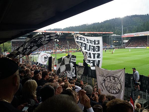 Auf der anderen Seite, über der Heimkurve, erhebt sich wie stets der Schwarzwald, Flutlichtmasten ragen in die Höhe, ein wunderbares Fußballbild. Auch bald Geschichte, wenn das neue Stadion erbaut ist. Die Freiburger präsentieren eine Choreo, die Eintracht aber präsentiert eine Truppe auf dem Platz, die so niemand auf dem Schirm hatte. Tawatha spielt von Beginn an, ebenso wie Neuzugang Evan N´Dicka. Hasebe und Abraham sind verletzt raus, Russ auf der Bank – na das kann ja heiter werden. Und schon nach wenigen Minuten fliegen die Bälle Torhüter Rönnow um die Ohren. Aber die Eintracht befreit sich, und Müller macht tatsächlich das 1:0 für die magische SGE. Jubel. Die Stimmung in der Kurve ist recht gelöst, das Spiel wogt hin und her, N´Dicka macht seine Sache gut – und die Abwehr wackelt, aber sie hält dicht. Da sich in der zweiten Hälfte ein gleiches Bild zeigt, die Freiburger fahrlässig mit ihren Chancen umgehen und Haller kurz vor dem Ende noch das 2:0 macht, fährt die Eintracht doch recht überraschend im ersten Spiel den ersten Sieg ein – neun Jahre nach dem letzten Auswärtssieg in Freiburg. Ein Törchen mehr, hätte die Tabellenführung bedeutet – aber das wäre wohl des Guten zuviel gewesen.