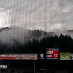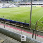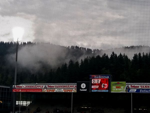 Matchday, die Eintracht spielt beim SC Freiburg, die Bahn in Emmendingen erreicht den Bahnhof 30 Minuten nach der planmäßigen Ankunft. 30 sinnlose Minuten der Warterei – und als sie ankommt ist sie proppenvoll. Eingepackt in Regenjacken quetschen wir uns in den Zug, ein Reisender unterhält die Mitfahrer mit Ansagen, die gnadenlos ignoriert werden (Gehn se doch mal weiter nach oben) und nach knapp 20 Minuten halten wir nach Denzlingen und FR-Herdern auch am Bahnhof. Wir schlüpfen durch den Bahnhof, wandern vor zur Straßenbahn und warten erneut. Da die UF im gleichen Zug war und nun von der Polizei eskortiert zum Stadion marschiert, dauert es ein paar Minuten, bis die Bahnen kommen, gleichfalls proppenvoll. Grischa steigt zu und gemeinsam rasseln wir hoch zum Schwarzwaldstadion, nehmen am Kiosk Tintenklecks noch ein Tannenzäpfle und wandern zum Eingang. an den Bussen überall ein großes Hallo, wir verschwätzen die Zeit und bereiten uns gedanklich schon darauf vor, das Spiel in der angrenzenden Kneipe zu schauen. Traditionell bestraft der Gästeblock den Zuspätkommenden mit einer miserablen Sicht von den Stehplätzen, aber diesmal ist alles anders. Der Einlass ist erschreckend problemlos, und wir sehen von oben sogar das Spielfeld. Also fast alles, das Tor auf unserer Seite ist wie immer verdeckt, ebenso die Ecken – aber immerhin.
