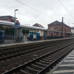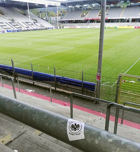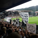 Nach Abpfiff bekommen von Ernst noch ein Bierchen in die Hand gedrückt und wandern wir noch rüber in die Heimkurve, die sich rasch geleert hat. Dort besuchen Achim, mit dem ich schon vor 20 Jahren hier Spiele besucht habe. Noch rasch ein Aufkleber verbabbt, ein Schöppchen im Fanhaus genommen und beschwingt sitzen wir wieder in der Straßenbahn. Dem Abendessen beim Thai folgt die kurze Bahnfahrt nach Emmendingen und alsbald liege ich in der Koje und schlafe den Schlaf des Gerechten.