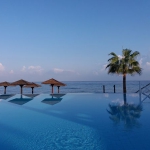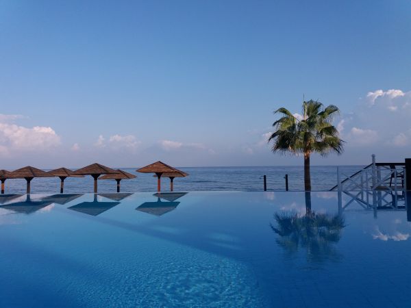 In aller Herrgottsfrühe klingelte der Wecker – und dies mit voller Absicht. Jetzt waren wir schon acht Stunden auf Zypern und ich hatte noch nicht einmal das Meer gesehen. Durch eine Unterführung kommst du vom Hotel aus direkt an den Beachpool und dahinter wogte das Mittelmeer in die Weite. Ich hatte den Blick zuvor schon im Netz gesehen, es sieht in Wirklichkeit noch größer aus; als läge die Kante des Pools exakt am Mittelmeer. Dazwischen lugen kleine Sonnenschirmchen in die Höhe. Wir genossen die Aussicht, lauschten den Wellen und hockten alsbald beim Frühstück im Freien. Überall wanderten Katzen umher auf der Suche nach Resten des Buffets. Der kleine Supermarkt, ein paar Schritte vom Hotel entfernt, offerierte sogar an exponierter Stelle Unmengen von Katzenfutter. Mittlerweile waren auch Maj und Pauline eingetroffen und winkten fröhlich vom Balkon gegenüber.