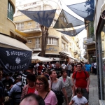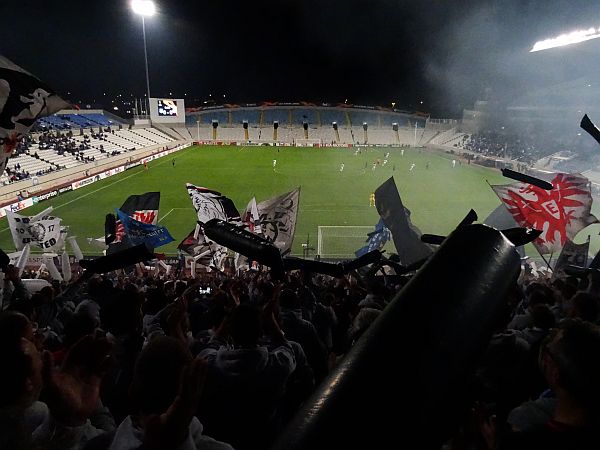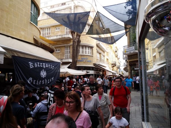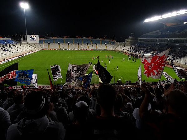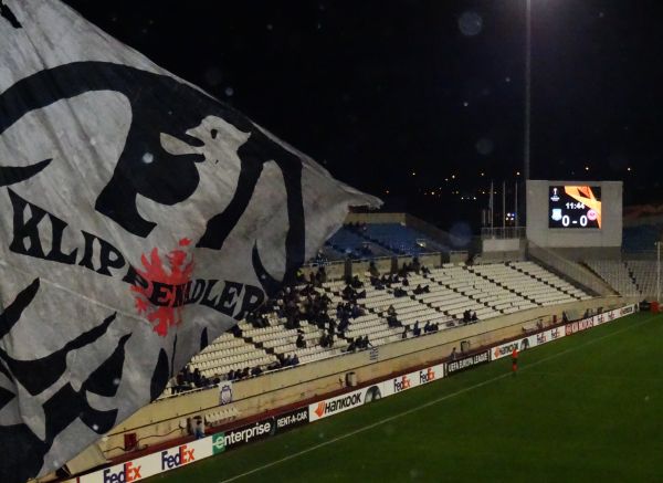 Der Rest spazierte durch die Fußgängerzone, die schon fest in Frankfurter Hand war und fand ein Plätzchen in einem Straßencafé – und je länger wir dort saßen, um so mehr Eintrachtler liefen auf, überall ein Gudewie. So warteten wir, einerseits auf die Rückkehrer, andererseits auf schusch, der die beiden Hoodies von Pia und mir dankenswerter Weise im Gepäck hatte. Irgendwann ploppten die ersten Schöppchen auf, ich hielt mich nach den ersten Tees am hiesigen Krautzer fest, wanderte mal nach oben, mal nach unten, derweil die Griesheimer um die Ecke einen festen Platz gefunden hatten und Fässchen um Fässchen leerten. Jetzt trugen fast alle die grauen Hoodies, und irgendwann trudelte die Kunde ein, dass es sogar noch vor Ort kistenweise Pullies zu kaufen gab, so dass auch wirklich jede/r die Möglichkeit hatte, sich einzudecken. Auch die Hotelrückkehrer trafen unbeschadet ein und dann kam auch schusch um die Ecke, in der Hand eine Plastiktüte mit unseren Pullis. Kurz darauf brachen wir auf und landeten in einem kleinen Restaurant ein paar Ecken weiter – auch dort trafen wir auf etliche Eintrachtler; wir speisten gut und gerne, hatten großen Spaß mit unserer Bedienung uns suchten alsbald die Stelle auf, von der die Shuttlebusse abfahren sollten. Wir waren viele, aber keine Busse weit und breit. Die Fanbetreuung hing am Telefon und als dann doch der erste Bus eintraf, gab es kein Halten, vergessen alle gute Manieren. Letztlich sind wir dann doch alle am Stadion gelandet. Zuvor war noch die Nachricht durchgesickert, dass Gürteltaschen nun auch erlaubt seien und zu guter Letzt schafften es auch etliche Feuerzeuge durch den Einlass – beides war noch gestern als Ding der Unmöglichkeit angekündigt worden, so dass in Nikosia wohl mehr Streichhölzer als je zuvor verkauft wurden und die Mädels ihren Krempel zunächst in Plastiktüten durch die Gegend schleppten.
