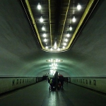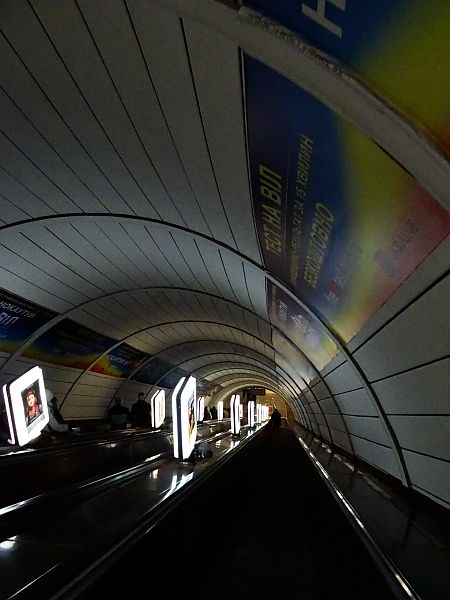Der Eingang zur Metro liegt direkt vor meinen Füßen an einem Markt. Lichtergewirr, Stände, Betriebsgewimmel. Eigentlich sollte ich mich hier ein bisschen umschauen, doch noch sind ein paar Aufgaben zu lösen. Ich lasse meinen Rucksack über die Schulter baumeln, laufe nach unten und entdecke prompt einen kleinen Schalter, an dem Tickets verkauft werden. Eine Fahrt kostet 8 Gwirna, für einen Euro bekommst du vier Fahrten, ich kaufe gleich zehn, um bei anderen Fahrten nicht im Zweifel anstehen zu müssen und bekomme 10 Plastikchips in die Hand gedrückt. Einen davon werfe ich in einen kleinen Schlitz am Durchlass und schon darf ich durch. Die Kiewer halten Ihre Wochen- und Monatsickets an ein Lesegerät. Mit ihnen warte ich auf die Bahn, die keine zwei Minuten später einrattert, ich steige ein, die Bahn rattert geräuschvoll weiter, und ich merke, wie ich entspanne, der Trip nimmt mich mit; ich bin unterwegs, die Menschen sind warm angezogen, sie steigen ein und aus, es ist voll in der Metro aber niemand drängelt. Neun Stationen bleibe ich in der Bahn, zähle jede einzelne mit, versuche die Schilder zu erhaschen, vergleiche sie mit den Schildern im Wagen, bis wir am Zoloti Vorota sind, dem Goldenen Tor, ich habe es geschafft. Hier steige ich aus – und lande an einer Rolltreppe, die bald 100 Meter in die Höhe führt. Schweigend rolle ich quasi minutenlang nach oben. Und zum ersten Mal habe ich das Gefühl: Ist das geil. Mittig leuchtet alle fünf Meter eine quadratische Leuchtreklame, Meter um Meter schiebe ich mich nach oben, es braucht noch eine zweite, kürzere Rolltreppe und dann stehe ich in Kiew auf der Straße. Ein paar Schritte um die Ecke und schon bin ich auf dem Platz, wo das Goldene Tor thront, der Platz, der für mich in den nächsten Tagen eine zentrale Anlaufstelle werden wird. Die Wege sind vereist, oft ungeräumt, Paare, Passanten. Ich krame meine Kopie eines Stadtplanes aus einer Hosentasche, doch so ganz ersichtlich wird mir nicht, wie ich laufen muss. Eigentlich sollte ich jetzt mein Navi anschmeißen, doch ich frage einen Auslieferungsfahrer nach dem Weg, er checkt sein Navi und zeigt auf eine der Straßen, die nach oben führen.
