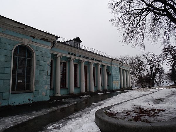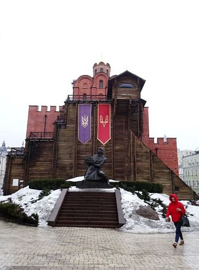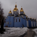 Es kam, was kommen musste. Der Dienstag ist der einzige Tag in der ganzen Woche, an dem ich keinen Termin habe, kein Zug fährt heute mit mir, kein Flieger, den es zu erwischen gilt, kein Fußballspiel, das angepfiffen wird – und es regnet. Nicht übermäßig, aber kontinuierlich. Aber was solls, ich muss raus, im Zimmer den Tag zu verplempern, wäre zu schade, schon am nächsten Morgen in aller Herrgottsfrühe geht meine Bahn nach Charkiw, also spanne ich den Regenschirm auf und laufe los. Natürlich wieder Richtung Goldenes Tor. Auf dem Weg dorthin kehre ich in einem kleinen Café ein, trinke Tee, esse ein Schokocroissant und gucke aus dem Fenster. Es regnet, aber es ist gemütlich, doch alsbald treibt es mich weiter. Über meinen Reiseführer habe ich mir einige Dinge zurechtgelegt, die Jungs hatten mir gestern noch ein paar Tipps gegeben – und so begebe ich mich auf ihre Spuren. Im Hotel habe ich zudem noch ein kleines Heft bekommen, welches verschiedene Stadtpläne in mehreren Größen enthält, so habe ich eine gute Übersicht – wobei mir Entfernungen und Zusammenhänge noch abstrakt erscheinen. Mein erstes Ziel soll die Sophienkathedrale sein, die ich auch bald erreiche. Mächtig steht sie dort, sie wird noch toller in der beleuchtenden Nacht erstrahlen, als an einem verregneten Februartag, doch davon weiß ich noch nichts. Was ich aber weiß ist, dass Wegweiser es hier einem leicht machen, sich von Punkt zu Punkt zu hangeln, einer davon weist auf den Majdan, den berühmten Platz in Kiew, Ausgangspunkt zu so manchem politischem Trubel. Hier trifft sich das Volk, wenn es die Nase voll hat. Heute geht es eher ruhig zu, der Verkehr braust, Reklame blinkt, auch die ukrainische Flagge leuchtet in die graue Vormittagsstunde. Ich überquere den Platz, auch dahinter schieben sich die Autos dicht an dicht. Hinter dem Majdan erhebt sich eine Parkanlage in die Höhe. Kiew, wie auch Rom, beherbergt sieben Hügel, einer davon liegt vor mir. Natürlich verschneit, vereist – aber immer noch reizvoller als an der belebten Straße entlang zu matschieren. Denn hinter dem Hügel fließt der Dnjepr – und eine goldene Regel sagt: Egal, wo du bist, wenn ein Fluss in der Nähe ist, gehe dorthin. Und so wandere ich los, wohl dem der festes Schuhwerk trägt. Wie schön es hier wohl ist, wenn der Mai ins Land gezogen und Schnee und Eis geschmolzen sind?