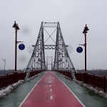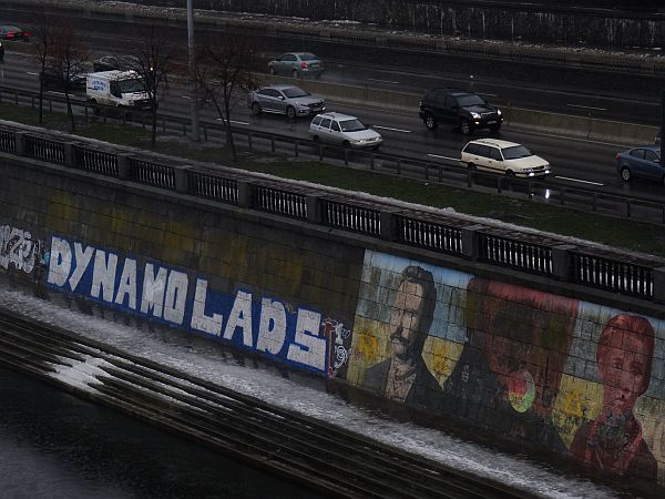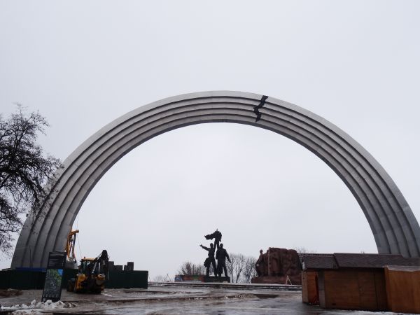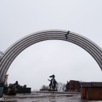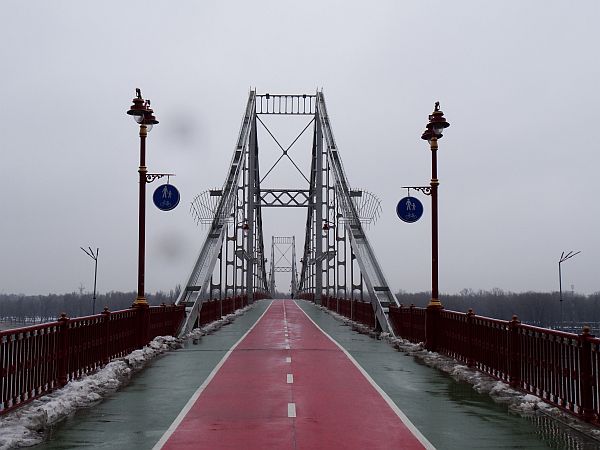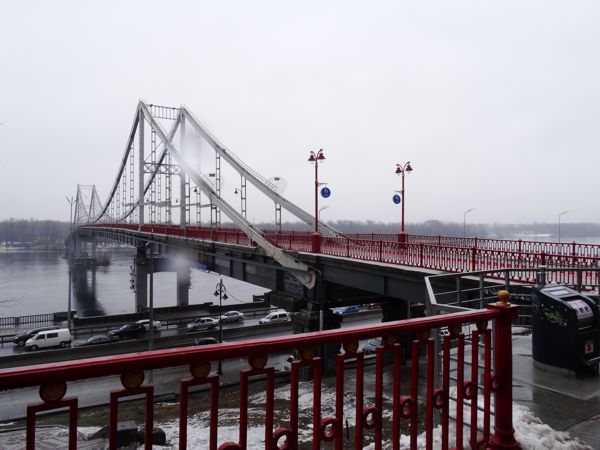 Das fragt sich auch meine Kamera, denn mit jedem Bild klatschen Regentropfen auf die Linse, na das werden schöne Fotos werden, da brauche ich gar nicht groß zu trocknen. Was, nebenbei bemerkt auch nicht ganz so einfach ist, denn mein kleiner brauner Regenschirm will ja auch gehandelt werden. Und so schiebe ich mich den Hügel nach oben, linker Hand die Kamera, rechter Hand den Schirm, derweil mein Mantel mich wärmt. Außer mir scheint kaum jemand hier, ab und werkeln ein ein paar Bauarbeiter in der Kälte, vor allem am riesigen Bogen, dem Denkmal der Völkerfreundschaft. Von hier blicke ich nach unten und entdecke die gigantische Fußgängerbrücke, die sich über den Dnjepr bis hin zum anderen Ufer spannt. Genau dort möchte ich hin, der Weg in die Ebene scheint auch genau darauf zu zu stoßen – und sieht auch halbwegs begehbar aus. Und so schlittern Mantel, Foto, Schirm und ich nach unten, es gelingt tadellos und schon stehe ich auf der Brücke. Ein gewaltiges Bild biete sich hier. Einerseits der Blick über die Brücke, andererseits der Blick über die untere Stadt. Auf der Straße reihen sich tausende von Autos, die Lichter glänzen im Regen, doch auf der Brücke ist es ruhig. In die andere Richtung blickend, entdecke ich die Flutlichtmasten des Dynamostadions hinter den Bäumen des Parks.