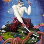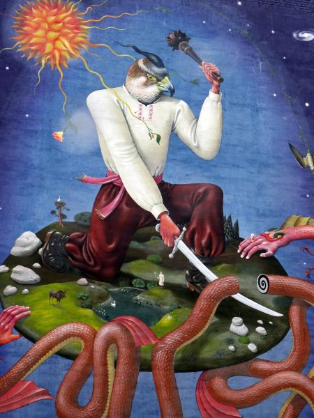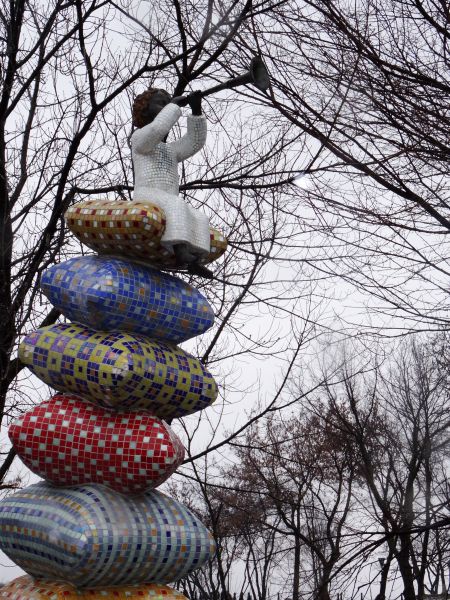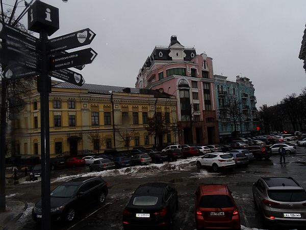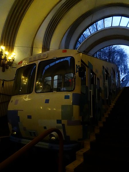 Gut gelaunt überquere ich die Brücke, ein Jogger kommt mir entgegen, der Wind weht meinen Schirm in den Tag – aber er bleibt stabil. Auf der anderen Seite erwarten mich zwei Hunde, die sich wundern, welcher Schrat ihnen denn da entgegen kommt, ansonsten ist hier nichts los. Die Buden und der Strand warten auf einen Sommer oder auf einen Frühlingstag, zu essen oder trinken gibt es hier auch wenig, also eher nichts und so kehre ich wieder um, bis ich meinen Ausgangspunkt erreiche und wieder in den Park stiefele. Weiter hinten wartet eine kleine Kirche, die ich auch bald erreiche. Dumm nur, dass die Treppen dermaßen vereist sind, dass die Stufen eine einzige glatte schiefe Ebene bilden. Ich rutsche abwärts wie derzeit der VfB Stuttgart, um den es mir weniger Leid täte, als um mich – aber ich schaffe auch diese Hürde und erreiche wieder festen Boden unter den Füßen, zumindest, was man hier im Winter darunter verstehen darf. Über den Schiffsanleger komme ich in das Viertel der Unterstadt, eine belebte Straße zieht sich durch Podil, in deren Mitte eine kleine Bahn die Kiewer und Touristen für 8 Gwirna den Hügel hinauf wieder nach oben bringt. Ich aber laufe weiter, bis ich den Andreassteig erreiche, eine der berühmtesten Straßen in Kiew. Was für Paris der Montmartre ist in Kiew eben der Andreassteig, der sich neu gepflastert an Restaurants und kleinen Geschäften nach oben schlängelt. In einer kleinen Galerie bleibe ich hängen, Psybildchen im Schwarzlicht laden den Betrachter bei psychedelischer Musik zum Verweilen, ein kleines Schild weist auf diesen Ort. Ich verweile und erstehe schon jetzt für Pia ein Mitbringsel, ein kleines buntes Bildchen, das noch eben so in meinen Rucksack passen wird. Jetzt habe ich beim Weitergehen in der einen Hand das Bild, in der anderen den Schirm und in der dritten meine Kamera. Das sieht lustig aus. Oben angekommen, passiere ich noch die wunderbare St. Andreas Kirche und hege den Verdacht, dass eine Straße weiter oben mich wieder ins Hotel führen könnte. Und tatsächlich, so ist es. Vorbei am pulsierenden Verkehr, an großflächig bemalten Häuserwänden schlendere ich über allbekannte Eiswege zurück in meine neue Heimat, nicht, ohne mich zuvor im „Billa“, einem um die Ecke liegenden Supermarkt mit Nahrung und Getränken einzudecken.