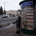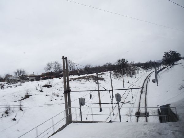 Der Wagen ist hochmodern, auf kleinen Monitoren laufen Werbung oder Zeichentrickfilme und auf die Minute genau rollt der Zug los. Mit gemächlicher Geschwindigkeit gleiten wir durch Kiew, es ist angenehm warm im Waggon, ich schaue aus dem Fenster, wie das verschneite Kiew an mir vorbei zieht. Nach wenigen Kilometern halten wir erneut, wir scheinen immer noch in Kiew zu sein, einige Fahrgäste steigen noch zu, dann nimmt die Bahn fahrt auf, die Ballungsdichte weicht verschneiten Feldern oder verschneiten Wäldern, mit knapp 160 Stundenkilometern rollen wir durch die Ukraine. In den Sitzreihen gegenüber wird fröhlich geschwatzt, die Energie in unserer Vierergruppe ist distanziert, jeder ist für sich, niemand lacht oder lächelt, niemand spricht, ich ziehe die Kopfhörer über, Bonnie Prince Billy singt „I see a darkness“ während endlose Felder nach endlosen Wäldern an uns vorbei gleiten. Ab und an radelt ein dick vermummter Frühaufsteher auf den verschneiten Wegen, warten einige Autos an einer Bahnschranke. Richtige Ortschaften passieren wir kaum, meist sind es Ansammlungen von kleinen Häuschen, die in Deutschland beinahe als Schrebergartenkolonnie durchgehen könnten, ich sehe wenig Licht. Aber Schnee, Felder, Wälder, wartende Autos an einer Bahnschranke. Nach einer Weile beschleicht mich das Gefühl, ich sitze in einer Märklin-Eisenbahn und wir fahren im Kreis.
