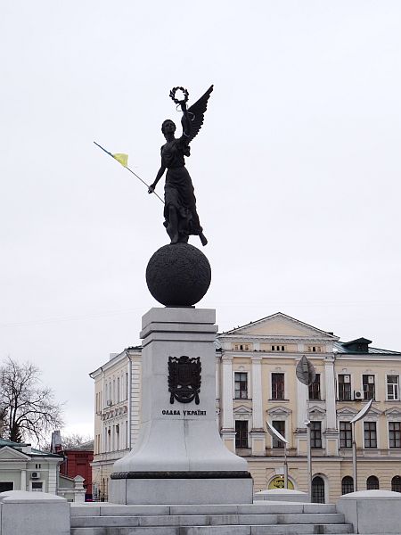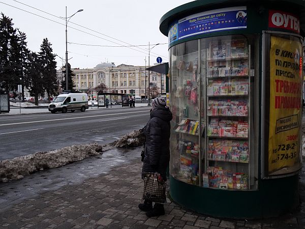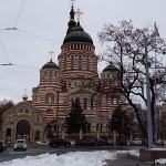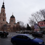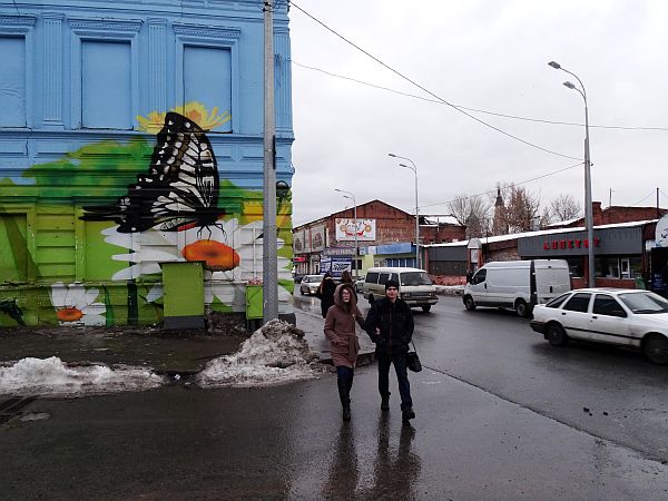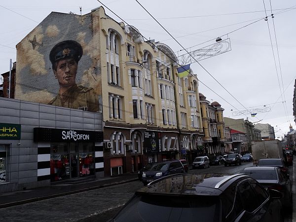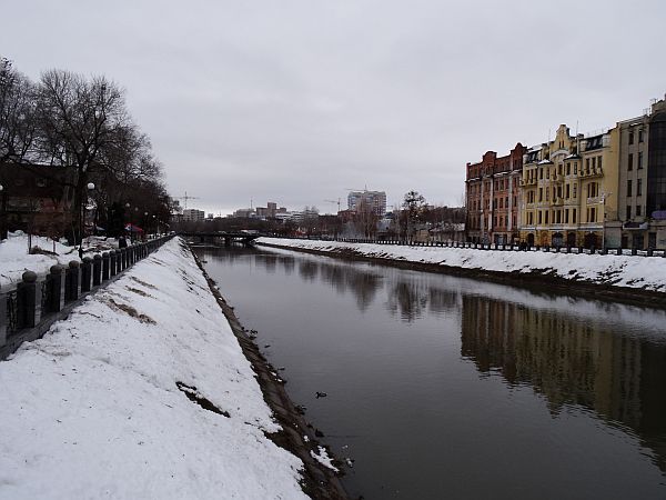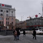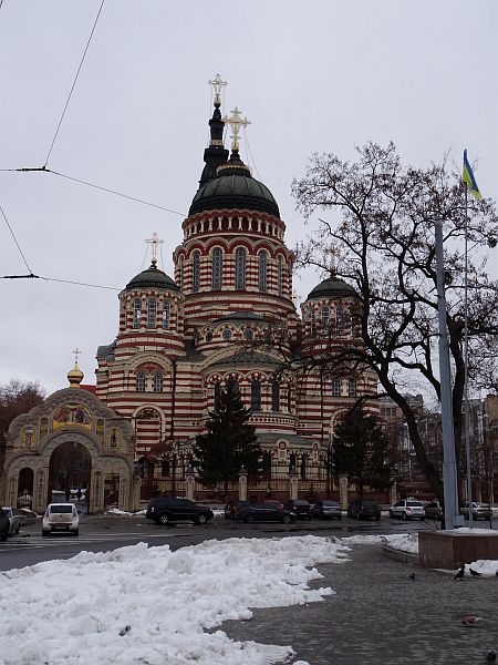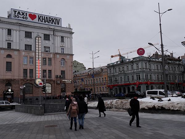 Frisch gefönt verlasse ich gegen 14 Uhr mein Zimmer und laufe runter durch den Hinterhof zur Rezeption. Hier, in diesem Eldorado des Tourismus wird es ja sicher einen Stadtplan geben, so denke ich – und höre leise, wie mich ein kleiner Dämon auslacht. Natürlich gibt es keinen Stadtplan, alles andere hätte mich auch verblüfft. Immerhin habe ich einen kleinen Kartenausdruck rund ums Hotel in meiner Hosentasche und da ich jene Kirche als erste Anlaufstelle ausgemacht habe, den dahinter liegenden Fluss Lopan als zweiten Orientierungspunkt wählte sowie den Constitution Square als dritten und letzten, setze ich mich in Bewegung. Zwischen meinem Hotel und dem großen Platz liegt ein guter Kilometer, und ich marschiere an der mächtigen Kirche vorbei, die sich als die Mariä-Verkündigungs-Kathedrale herausstellt. Sie wird später noch oft fotografiert werden und dient durch ihre Größe als perfekter Wegweiser, auch den Lopan erreiche ich bald, ich überquere den Fluss, steige in einer Parkanlage ein paar Treppen vorbei an Bilderverkäufern, deren Werke am Zaun hängen, nach oben und erreiche den Constitution Square, einen mächtigen Platz mit einer großen Statue als Mittelpunkt. Nach oben schlängelt sich die Sumska Street, wohl die zentrale Straße der Stadt. Hier reiht sich Geschäft an Geschäft, Restaurant an Bar an Café. Dies alles liegt näher beieinander als ich dachte. Auf dem Weg nach oben wandere ich an einer Art Hofbräuhaus vorbei, bairische Rauten verkünden mir: Zieh weiter. Nach oben hin werden die Geschäfte weniger, ein vereister Springbrunnen vor einer weiteren mächtigen Kirche zieht die Aufmerksamkeit auf sich, gegenüber befindet sich ein aus sozialistischen Zeiten stammendes Kulturzentrum. Noch weiter oben wartet ein großer, vereister Park auf besseres Wetter. Obgleich so kalt wie befürchtet ist es nicht. Unterwegs treffe ich einen ersten Eintrachtfan, der mich an eine Markthalle erinnert, dort soll auch die Metrostation sein, die meinem Hotel am nächsten liegt – und die ich auf Maps nicht finden konnte. Vielleicht entdecke ich sie ja.