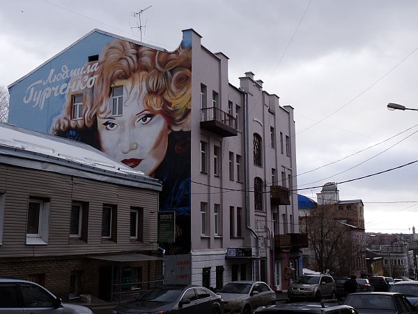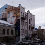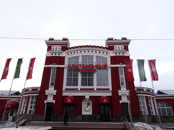 Und tatsächlich, nachdem ich mich durch die jenseits der Hauptstraße liegenden Straßen zwischen Buntheit und Verfall durch gekämpft habe, erspähe ich eine weitere Brücke über den Lopan und dahinter spitzt die rote Markthalle in den späten Nachmittag. Gegenüber ist auch der Eingang zur Metro Tsentralny Rynok, so langsam beginnt sich ein weiterer Kreis zu schließen. Das Gelände ist rundum uneben, einfach, vereist, grau, Straßen mit vielen Autos, mit gut funktionierenden Zebrastreifen und Reklametafeln an den Häuserwänden. In der wunderbaren Markthalle selbst wird gerade eingepackt, eine ukrainische Verkäuferin versucht, noch ein letztes Stück Speck an mich zu verkaufen, ich lehne dankend ab und spaziere nach draußen, umrunde die Halle und sehe eine Art Restaurant mit Aufkleber der Speisen an den Wänden. Und so nehme ich meinen Mut zusammen. Die erste Tür, die ich öffne, ist eine Bäckerei, es sieht gut aus, jedoch steht mir nicht der Sinn nach Gebackenem. Hinter der zweiten Tür nebenan offenbart sich jedoch ist eine Gaststätte. Die schwere Holzvertäfelung an den Wänden scheint für die Ewigkeit gemacht, ebenso der steinerne, an Marmor gemahnende Boden. Aber alles scheint hergerichtet für die werktätigen Massen, es wirkt einfach und gut. Etliche Bilder hängen an Wänden, zeigen Ikonen, zeigen Landschaft. Die Wirtin am Tresen blickt mich mit ihren eisblauen Augen an, versteht aber kein Englisch. Wahrscheinlich bin ich überhaupt der einzige, der hier jemals Englisch gesprochen hat. Drei, vier Männer sitzen an den wenigen Tischen, löffeln Suppe, brechen Brot. Sie werden nicht viel Geld haben, wie hier viele Männer eine Art Härte ausstrahlen, geprägt durch die Kälte und die kargen Löhne gepaart mit harter Arbeit. Die Frauen können hübsch sein, sehr hübsch sogar. Wenn sie das Leben hier nicht welken lässt.