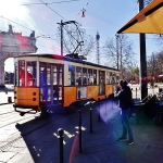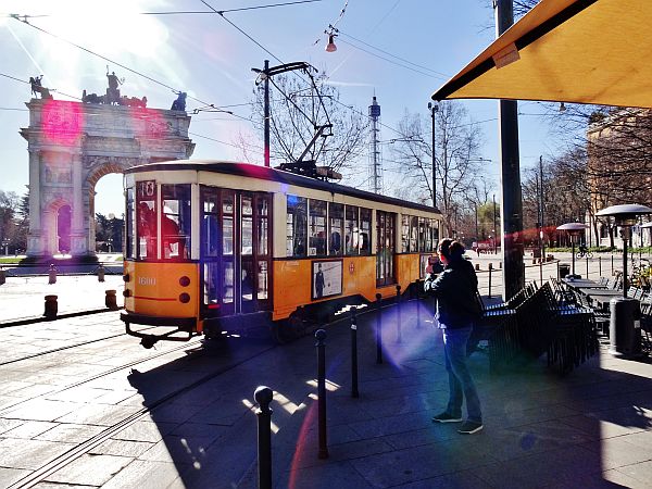 Und dann kam, was kommen musste. Ich bleibe an einem Schuhladen hängen. Und komme ein paar Minuten später mit einer Tüte wieder heraus. In der Tüte lungern meine weißen Adidas Samba, an den Füßen trage ich italienisches Schuhwerk. Pia ist dezent neidisch. Weiter unten beginnt die Corso di Porta Ticinese, eine bummelige Einkausfstraße mit Läden und Restaurants, Grafittis und Vintagestores – und wer will, kann sogar im Green Tunnel ein Tütchen Gras kaufen, hoch legal, selbstverständlich. Nach einem kleinen Bummel, kommt dann auch Pia zu ihrem Recht. Vintagestores sind natürlich mit magischen Kräften versehen, leerer Hand gehst du hinein und schwer bepackt wieder heraus. Die Waage ist ausgeglichen, jede(r) von uns ist nun bepackt. Und dann ruft es plötzlich: Acht mal die acht. Ich drehe mich um – und erkenne Andreas lachend in einem Straßencafé sitzen. Das ist ja ein Ding. Wir haben uns in einer Bar in Charkiw kennen gelernt – und treffen uns jetzt wieder. In Mailand. Acht mal die acht war übrigens das WiFi Passwort in der Charkiwer Bar. Und so trinken wir ein Kaltgetränk in der Sonne, bis sich Pia und ich auf den Weg zur historischen Straßenbahn machen. Und die 10 bringt uns dann auch Richtung Hauptbahnhof, unterwegs rumpeln wir an etlichen der Gegenden vorbei, die wir gestern noch per pedes erkundet haben – jetzt wissen wir Bescheid.