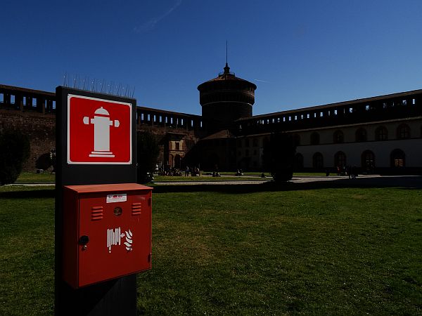 Und das Stadion steht auch noch am nächsten Morgen, bedeckt von einem klarblauen Himmel und schon sind wir wieder auf der Straße und erkunden die Stadt, wandern an den neuen Hochhäusern an der alten Messe vorbei durch einen kleinen Park, bis wir unsere erste Station erreichen, den großen Simplon Park. Hier befindet sich das alte Stadion, das aber leider nicht offen hat, hier trinken wir an einer kleinen Bude einen fabelhaften Cappuccino, hier warten Karussells und bunte Buden auf Besucher. Ein paar Meter weiter hinten entdecken wir in einem kleinen Teich jede Menge Schildkröten, die ihre Hälse wie wir in die Sonne recken. Durch die angrenzende Festung Castello Sforzesco spazieren Jugendgruppen, wie in allen Zeiten Jugendgruppen durch Sehenswürdigkeiten spazieren, mit kaputten Hosen und dem Blick nur auf das nächste Mädel oder den nächsten Kerl gerichtet. Schnatternd, und gickelnd ziehen sie weiter – in ihr Leben und werden irgendwann Jugendgruppen durch Sehenswürdigkeiten spazieren sehen und sich denken: Gott, so war ich auch mal.