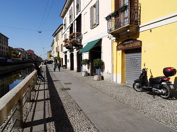 Eine Zwei-Tageskarte kostet 8,25 Euro – das ist fair und schon landen wir an der Station Porta Genova. Da Mailand nicht wirklich an einem Fluss liegt, müssen die Kanäle für mediterranes Flair herhalten – und och jo, hier ist es Urlaub. Wir spazieren am Kanal entlang, frühstücken in einem kleinen Café, lassen uns die Sonne auf die Nase scheinen und freuen uns des Daseins. Die Wassermassen am Kanal sind allerdings überschaubar. Mailand ist nicht Venedig, das ist eindeutig. Und der junge Kellner etwas verschlurcht. Aber die Croissants sind himmlisch.