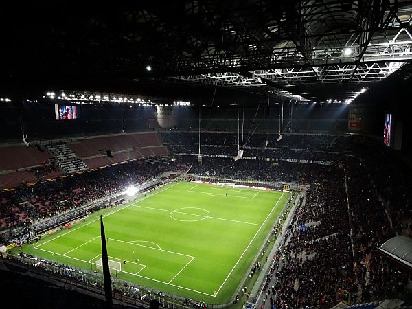Die Metro bringt uns zurück in unser Viertel, elf Stationen fahren wir – Gambara heißt die Haltestelle und nach einem kurzem Zwischenstopp im Appartement geht’s raus für eine Pizza. Gegenüber, im Supermarkt, wandern noch drei Peroni in unsere Taschen und als wir nach Hause kommen, leuchtet die Anzeigetafel im Stadion auf, wir erkennen das Wappen der Eintracht mit bloßem Auge. Von unserem Balkon. In Mailand.