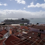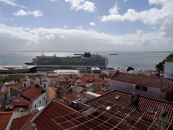 Kaum haben wir das Café verlassen, beginnt es wieder zu regnen, wir drücken uns an den Wänden entlang und finden in einem kleinem Durchgang ein trockenes Plätzchen. Ein Gitarrist spielt seinen Fado in den Tag, eine Künstlerin verkauft ihre bunten Drucke und ein paar Leute stehen mit uns trocken und lauschen der Musik. Pia kauft sich eines der Bilder, die Künstlerin freut sich, der Regen weicht leichtem Sonnenschein und wir wandern weiter, hoch zum Forteingang – Andenkenverkauf, Restaurants, Schlange – wir schenken und den sicherlich wunderbaren Blick vom Park über Lissabon und wandern durch Gassen und Gässchen runter in die Alfama, diese hügelige Altstadt, die trotz allem Touristengewusel noch immer den alten Charme Lissabons versprüht. An einem großen Platz warten moderne TucTucs auf Touristen, die sich für teuer Geld durch die Gassen chauffieren lassen, unten am Tejo versperrt ein Kreuzfahrtschiff den Blick in die Weite. Von hier oben kannst du zwar darüber hinweg sehen, aber wenn du durch die Gassen der Alfama schlenderst, ergibt sich immer wieder zwischen zwei Häuserreihen eine Treppe hinunter der Blick über den Tejo. Dank der Kreuzfahrtschiffe aber blickst du nun auf die Kabinen der Passagiere, die wahrscheinlich zuviel Geld und zu wenig Geschmack haben. Es hat den gleichen Effekt, als wären direkt hinter dem Flussufer an schönster Stelle riesige Bunkerhotels gebaut. Zuweilen lagen gleich drei dieser Giganten vor Ort. Ich hasse sie. Und sollte sie in den nächsten Tagen noch mehrfach verfluchen, diese Dreckschleudern, diese gigantischen Horte des Egoismus, diese Mittelfinger in Richtung schönes Leben für alle.