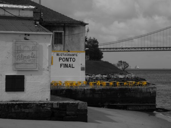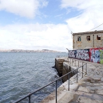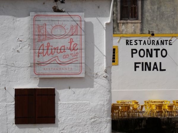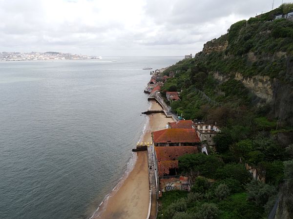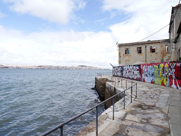 Und da ist er schon, der zweite Tag. Er beginnt mit Pasteis und Galao im Café do Largo hinten am Platz. Unser heutiges Ziel liegt auf der anderen Seite des Tejo, von daher lösen wir ein Ticket für die Bahnen und die Fähre an der Metrostation Martim Moniz. Von dort geht es schnurstracks zum Cais do Sodré, einem der Orte, an dem die Fähren über den Tejo ablegen. Da die erste vor unserer Nase abfährt, müssen wir uns etwas gedulden, doch schon 15 Minuten später legt eine weitere bei uns an – und spuckt jede Menge Passagiere aus, die von den Vorstädten nach Lissabon tuckern. Auf die andere Seite wollen um diese Zeit weit weniger Menschen, wir finden leicht einen Fensterplatz und schieben uns über den so oft besungenen Fluss. Die Fahrt dauert nicht lange, keine Viertelstunde, und schon sind wir in Almada und blicken auf die Hügel Lissabons. Leichter Regen setzt wieder ein, einerseits schade, da es etwas ungemütlich ist, auf der anderen Seite sind wir nahezu alleine, als wir am Ufer Richtung der Brücke des 25. April spazieren. Direkt am Ufer führt ein auf den ersten Blick wenig einladender Weg an parkenden Autos vorbei. Häuserwände ziehen sich nach oben, mal siehst du ein Atelier, mal eine kleine Werkstatt doch je weiter du wanderst, um so zerfallener werden die Häuser, die Wände durchgehend mit Graffitis besprüht, hier und da fischt ein Angler nach Sardinen und auf der anderen Seite pulsiert das Leben Lissabons. Es ist ein morbider Weg, mal hängt in den Ruinen Wäsche zum trocknen, mal siehst du in einem der zerfallenen Häuser ein verbranntes Auto inmitten von Müll und in einiger Entfernung begrüßt von hoch oben der Christo Rei die Reisenden.
